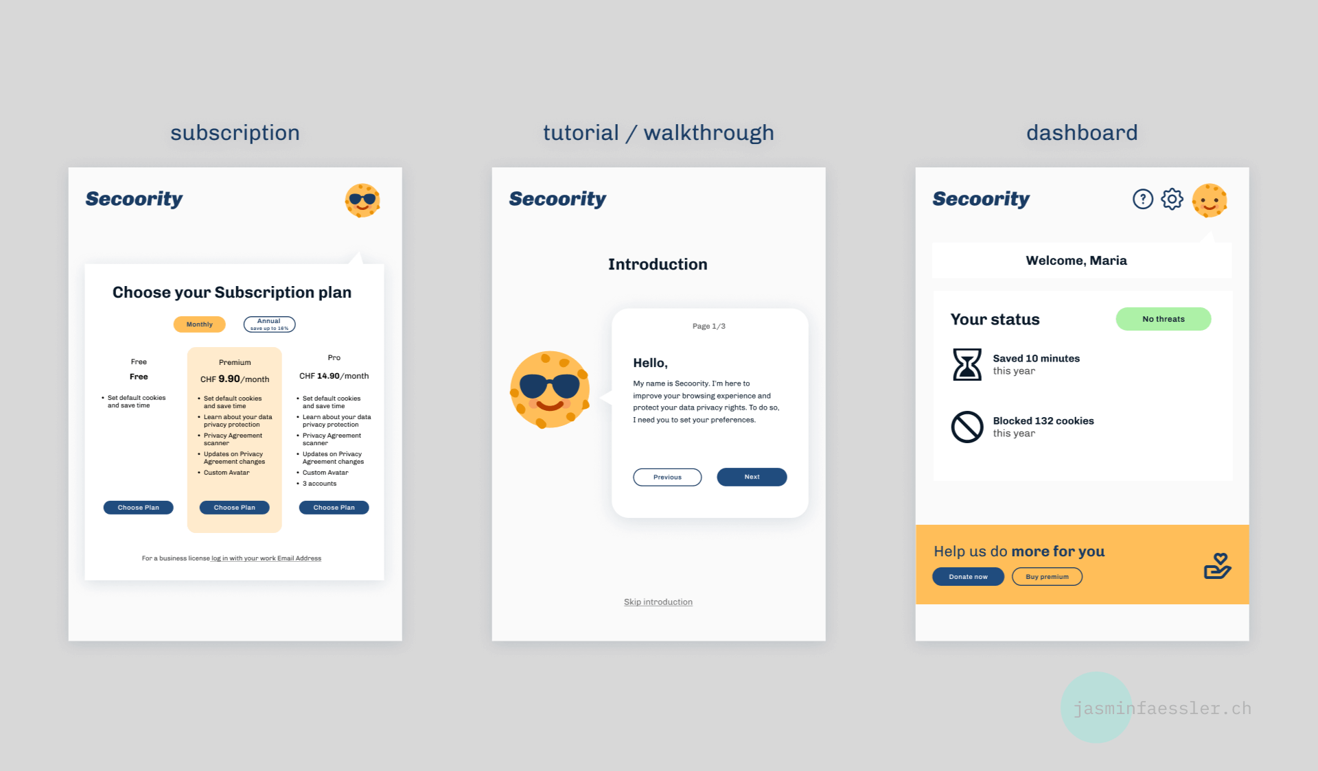 Im Team am Konzept mitgearbeitet, den UI-Prototyp für die Browsererweiterung gestaltet, Visualisierung vom Branding, Maskottchen und den Screens.